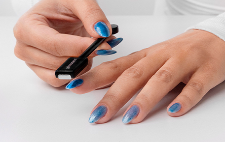 Apply a second coat of magnetic gel polish. DO NOT CURE. To create the magnetic design, hover the magnet slightly above the UNCURED POLISH, being careful not to touch it. The magnetic shimmer will move with the magnet—have fun exploring all the possibilities!