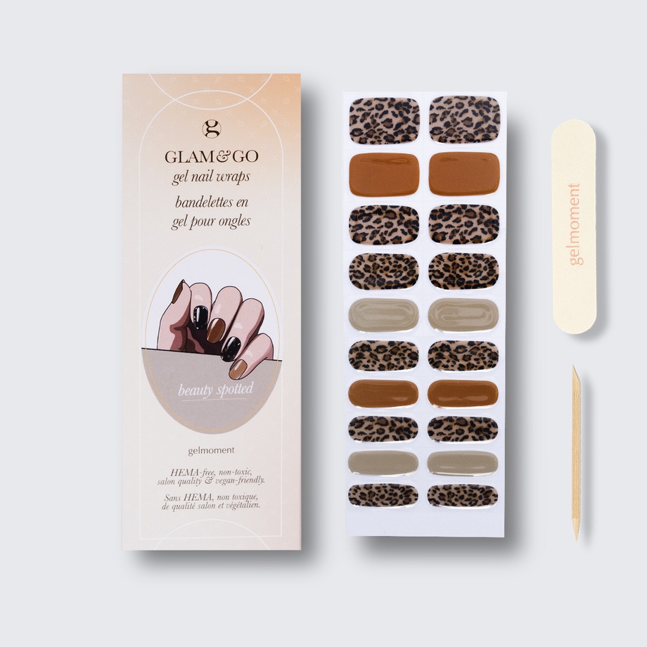 Our GLAM & GO gel nail wraps ensure that no matter how complex your chosen nail design, the application process remains incredibly simple. Our GLAM & GO gel nail wraps require no glue, base coat, or top coat—just peel them off the packaging, apply them to your nail, trim to size, cure twice, and voilà!